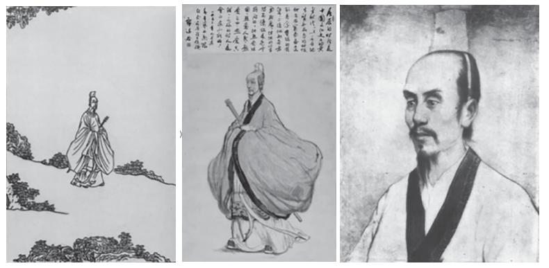 左:陈洪绶《屈子行吟图》中的屈原形象;中:蒋兆和绘制、郭沫若题词的《屈原像图轴》,此为文联纪念会场悬挂的《屈原像》;右:世界四大文化名人纪念大会会场悬挂的《屈原像》