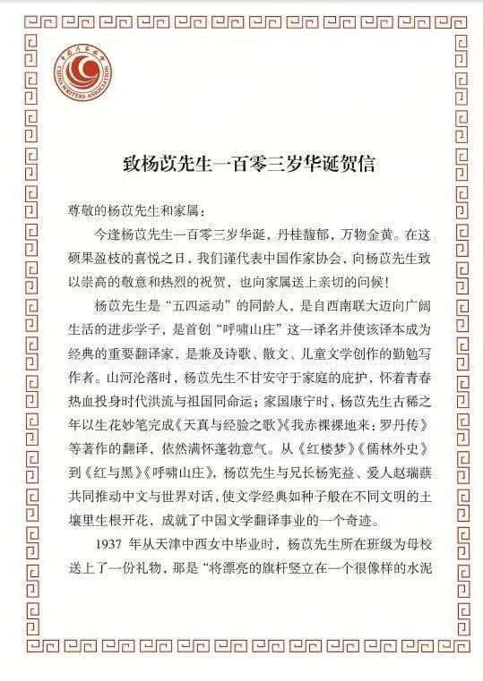 铁凝主席、张宏森书记深情祝贺杨苡先生103岁华诞