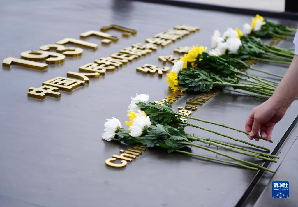 9月18日,中国人民抗日战争纪念馆的工作人员向独立自由勋章雕塑献花。新华社记者 张晨霖 摄