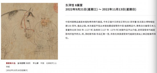 对于此次展览,东京国立博物馆在官网上如是介绍:“中国书画精品展是本馆秋季的例行展览。今年正值中日邦交正常化50周年暨东京国立博物馆创建150 周年。值此之际,本次展览不仅从本馆收藏或保管的中国绘画精品中,聚焦自古备受日本人喜爱的北宋(960 年-1127 年)及南宋(1127 年 -1279 年)时期作品予以介绍,还将深受宋代绘画影响所创作的元、明、清时期书画珍品汇聚一堂,供各位来宾感受宋代绘画在画坛上举足轻重的地位。”