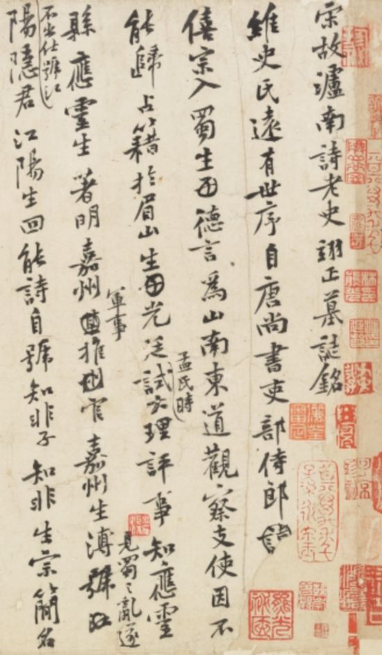 而《宋卢南诗老史翊正墓志铭稿》,凡二十一行,另补写五行,行二十字左右。全稿文字涂改约二十处,亦非定稿本。“泸南诗老”史扶,字翊正。史氏家族自唐僖宗年间入蜀,占籍于眉山。史氏少时笃学能诗,然屡试科举不第,后游泸州,闭门读书并教授弟子,士人推与之曰“诗老”。绍圣三年(1096)四月卒于泸州,葬于元符二年(1099)正月。时黄庭坚贬官戎州(今四川宜宾),史扶嫡次子史镇遂请为撰墓志铭。此墓志铭稿无署款及年月,因其中有"葬以元符二年正月癸亥",徐邦达先生《古书画过眼要录》定此墓志铭为元符二年所作,时山谷五十五岁。