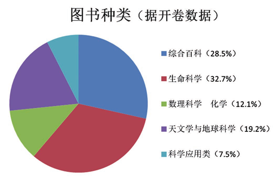 在中国图书馆分类法中,科学部分被分为N(自然科学总论)、O(数理科学与化学)、P(天文学、地球科学)、Q(生物科学)、R(医药、卫生)、S(农业科学)、T(工业技术)、U(交通运输)、V(航空、航天)、X(环境科学),其中工业技术又分为矿业工程、冶金工业等13类。根据该分类法以及少儿图书出版情况,可以将少儿科普读物分为五类:综合百科类、生命科学类(包括生物科学、医药卫生)、天文学与地球科学类、数理科学与化学类、科学应用类(包括农业科学、工业技术、交通运输、航空航天)。