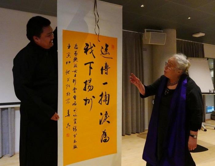 国际说书曲艺协会德国负责人刘辉向易德波转赠了中国曲协主席姜昆的书法贺幅作品,并宣读了中国曲协的贺辞。