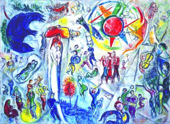 自1966年起直至1985年,夏加尔在法国普罗旺斯的圣保罗-德-旺斯镇安家,创作了大量以当地秀丽景致为源泉的野逸画,成为法国的“蔚蓝海岸派”画家。他的画作曾两度在中国展出,得到中国观众的喜爱。早在1978年,笔者初次到巴黎就接触到他的绘画作品,看见街头报亭里摆着他的曼妙画幅《雅各的梦》和《埃菲尔铁塔的新婚夫妇》,而后又在尼斯和艾克斯参观了他的绘画展览。还值得提及,巴黎大歌剧院穹顶中心的彩绘天花板是马尔罗于上世纪60年代初特邀请夏加尔设计的,上面画有《火鸟》《天鹅湖》和《魔笛》等著名舞剧的图像。他曾为《雅各的天梯》一画配诗,作为给自己绘事生涯的归结: