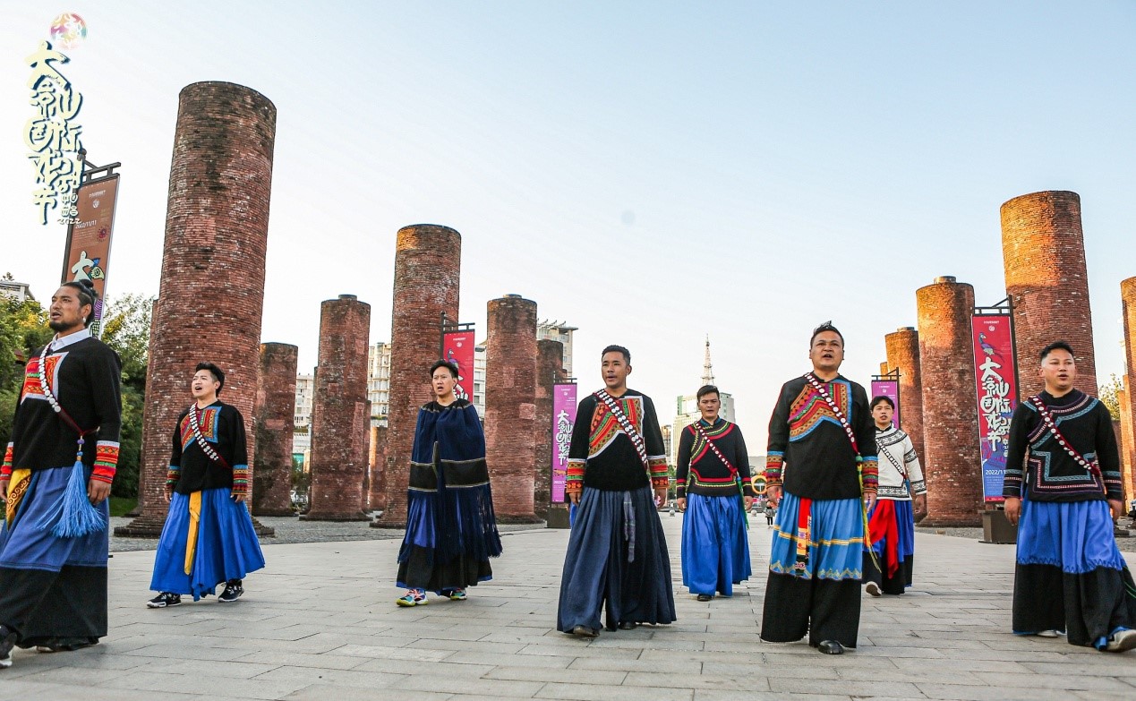 时间拉回到一年前。暖阳下,泸山间,一群来自大凉山的原生态彝族歌者,通过彝族高腔、毕摩的经诵和民间说唱等形式,串起一个古老民族灵魂的吟诵——大凉山原生歌集《赶集》。作为2021第三届大凉山国际戏剧节最具凉山地域特色的剧目,当天的谷剧场同样是蓝天之下,以地为席,以山为幕,彝族的非遗歌者们演奏出风声、鸟叫声,伴随低沉的男声、婉转的女声、稚嫩的童声带领观众聆听大凉山这片土地发出的声音。