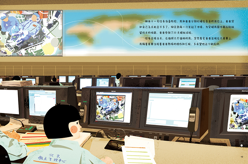 赵墨染:2016年我在清华美院读书的时候选择做科普绘本的研究,有了一些科普绘本的创作经验。2018年中国少年儿童新闻出版总社的唐威丽老师联系到我说有这样一个航天员的故事,问我感不感兴趣。本身我对航天题材也很感兴趣,看了邓清明父女《朗读者》的节目后,被深深地打动了。之后在出版社的安排下我和邓清明的女儿满琪见面了,自此开始了电竞竞猜三年的创作之旅。这三年电竞竞猜线上线下沟通了多次,她给我提供了非常详尽的资料。比如故事的脚本,相关的影像资料,参考书籍、电影和纪录片等等。从文字到分镜图再到正稿,满琪很认真地校对每一处。因为她作为航天人的专业背景,有她在我会很踏实。说到印象最深的瞬间是神舟十一号任务准备阶段,满琪在指挥大厅值班看到爸爸出现在大屏上,她眼含泪水的样子让我难忘。
