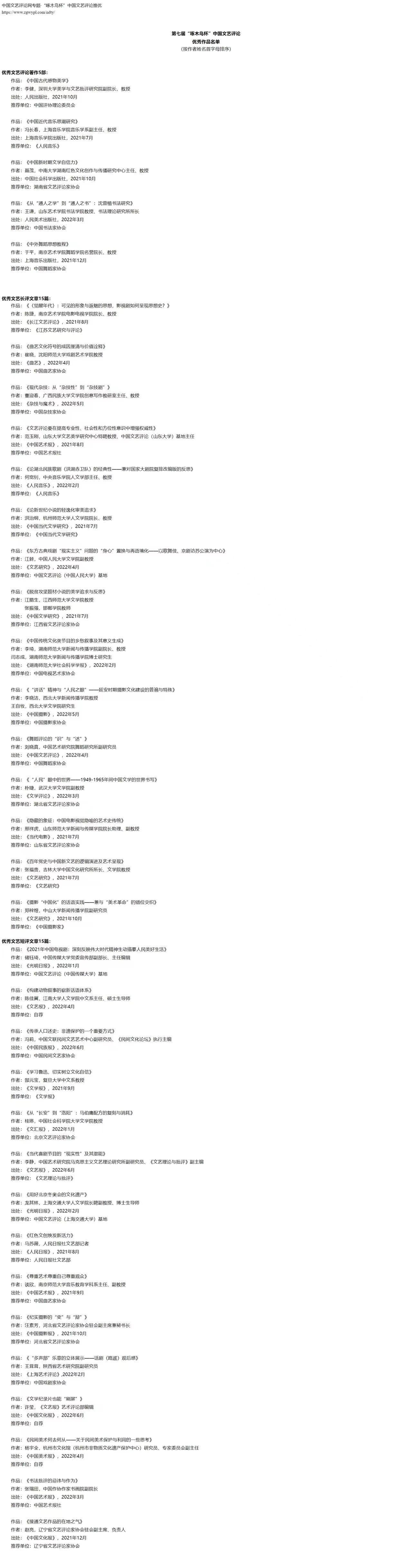 本届推优活动作品经过推荐单位按名额推荐和中评协会员自荐,共收到作品705份,其中著作76部、长评442篇、短评187篇。推优秉承坚持导向、注重质量、宁缺毋滥的原则,经过初评、复评、终评,并报中国文联批准,最终推选出李健《中国古代感物美学》、冯长春《中国近代音乐思潮研究》、聂茂《中国新时期文学自信力》等优秀文艺评论著作5部,陈捷《<觉醒年代>:可见的形象与返魅的思想,影视剧如何呈现思想史?》、崔晓《曲艺文化符号的成因厘清与价值诠释》、董迎春《现代杂技:从“杂技性”到“杂技剧”》等优秀文艺长评文章15篇,许莹《文学纪录片也能“刷屏”》、李静《当代喜剧节目的“现实性”及其潜能》、陈佳冀《构建动物叙事的崭新话语体系》等优秀文艺短评文章15篇。“啄木鸟杯”中国文艺评论年度推优活动涵盖文学、戏剧、电影、电视、音乐、舞蹈、美术、摄影、书法、曲艺、杂技、民间文艺以及艺术学理论等领域,旨在推出优秀文艺评论作品,激励文艺评论工作者,推进全国文艺评论创新和繁荣,促进文艺事业健康发展。推优活动每年举办一次,2016年至2021年已成功举办六届。