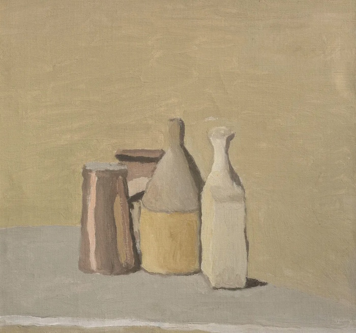 然而,这两位艺术家几乎没有任何相似之处。莫兰迪不像塞尚和他的立体派追随者那样将感知拆开,相反,他专注于事物形状的平凡与诗意。一个顶部为柠檬黄的柠檬榨汁机陶器,一个蓝白色的碗,一个颈部细长的白色瓷瓶,在他创作于1936年的巨幅油画《静物(Still Life)》中,这些物品都是被摆放在灰色空间里的日常厨房用品,并无什么特色。