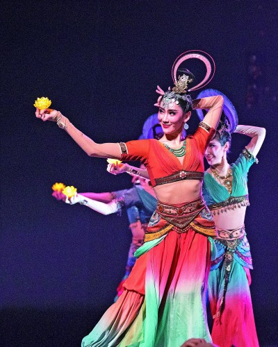 ¡¶½õÐå¡·ÃèÊöµÄ³¡¾°ÊÇ£¬ÉÏÔª½ÚµÆ»ðÆÌÂúÌì¿Õ£¬ÎèÕßÉíןºÊ½³¤È¹£¬²½·¥ÇỺõäõÑ£¬ÔÚÖ¯½õµÄ¾Î³ÏßÉÏÆðÎ裬¡°ÎåÐdzö¶«·½ÀûÖйú¡±Ö¯½õ»¤±ÛÖð½¥³ÊÏÖÔÚÑÛǰ£¬ººÌÆÎ¶Ê®×㣻¡¶Ô¶¹ÅµÄºô»½¡·Õ¹Ïֵľ°ÏóÔòÊÇ£¬ÔÚ¾«¾ø³ÇÊ×Áì¿î´ý±ö¿ÍµÄÒ¹ÑçÉÏ£¬ÎèÕßÃÇÉí×Å»ªÃÀ·þÊΣ¬ÊÖ³ÖÁ«»¨µÆôæôæÆðÎ裬·Â·ð¹ê×ȱڻÖеÄÏÉ×ÓÏ·²£¬Î÷Óò·çºÜŨ¡£
