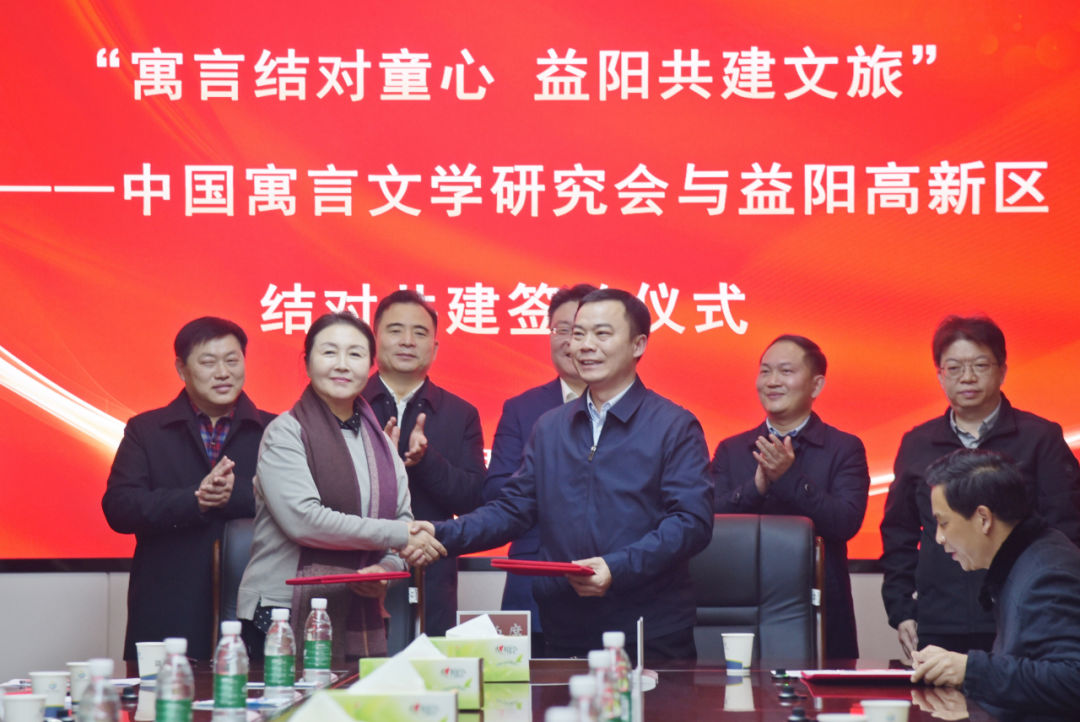 会后,还举行了“寓言结对童心 益阳共建文旅”中国寓言文学研究会与益阳高新区结对共建签约仪式。肖惊鸿、喻理科分别代表双方正式签约,刘益希主持签约仪式,李晓东、汪军、刘戈、谢乐军、包后勇等共同上台见证。双方将积极推进多项合作,开设文学专题讲座、建设中国寓言文学研究会儿童书屋、深入文学调研走访、开展寓言童话进校园活动、举办全国儿童文学类颁奖或赛事等,助力清溪村开创更具辨识度的新文化,努力将中国寓言以更为丰富、崭新的形式呈现在大众面前。