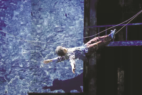 首先,该剧跳出了传统杂技剧的固有范式,为杂技剧的全新内涵延展提供了重要助力。传统杂技剧的任务是在一个相对简单的故事情境里完成高难度的杂技表演,将观众的聚焦点始终锁定在杂技动作上。严格来讲,这时的杂技剧尚不能称之为戏剧,因为它欠缺故事线索,更谈不上人物塑造,而仅仅是为杂技节目和技艺的表演提供一个假定环境,在一定程度上增强观众在观演时的视觉体验。随着《战上海》《呼叫4921》等新杂技剧的横空出世,杂技剧在“剧”的维度上迈出了一大步。在上述作品中,观众看到了完整的故事线索、明确而饱满的人物形象,精彩的杂技表演成了服务剧作与主题的手段,使得剧情与奇观、绝活相得益彰。该剧在这一方向上继续前行,让杂技表演不仅成为叙事手段,更成为人物心理空间的外化,进一步丰富了舞台语义的层次感。比如在传递情报一场戏中,我方侦察员乔装成蓬头垢面的乞丐,在小萝卜头的帮助下,在闹市中与特务周旋,最终顺利完成任务。这时,导演十分巧妙地插入了一段侦察员走钢丝的表演,可以说是神来之笔。侦察员内心的惊、传递情报工作的险,与走钢丝节目既有的惊和险实现完美贴合,进而生发出一种概念蒙太奇的艺术效果。换言之,此时剧场中的观众并不仅仅是在观看一段杂技表演,而是在跟随剧中人物一起经历内心世界的波澜起伏。类似手法在剧中广为应用,比如表现女牢房中我方狱友与敌人军官对峙的一场戏时,导演植入了高空皮条节目,将双方剑拔弩张、残酷斗争的人物关系和气氛张力烘托到了极致。