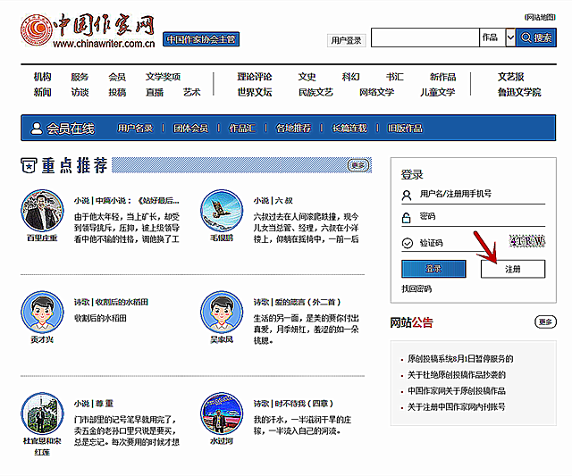 2、在原创频道页面右侧原创会员登录区域找到“注册”(标红色箭头处),点击方可进入用户注册页面。