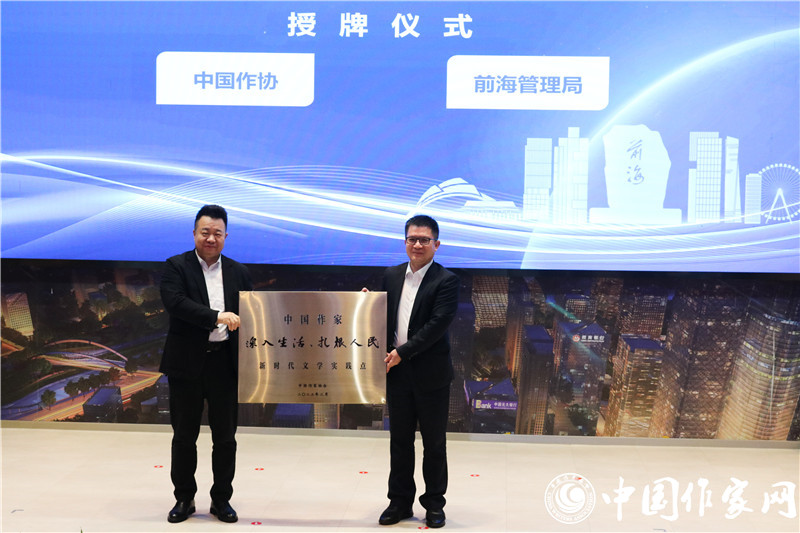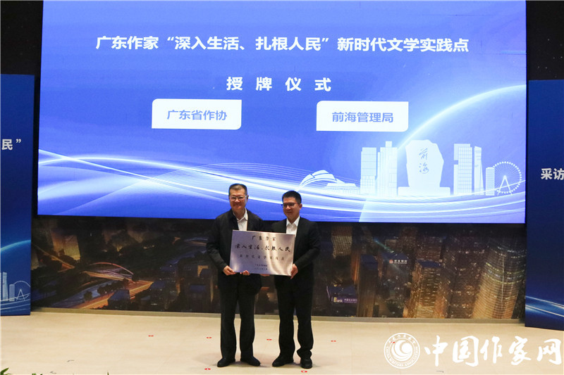 陈昆代表广东省作协授予广东作家“深入生活、扎根人民”新时代文学实践点牌匾,王锦侠代表深圳市前海管理局接牌