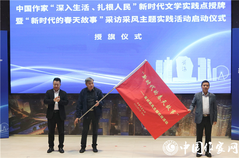仪式上,彭学明、陈昆、王锦侠分别代表电竞竞猜、广东省作协和深圳市前海管理局签订“新时代文学实践点”三方合作协议。邱华栋代表电竞竞猜授予电竞竞猜“深入生活、扎根人民”新时代文学实践点牌匾,陈昆代表广东省作协授予广东作家“深入生活、扎根人民”新时代文学实践点牌匾,王锦侠代表深圳市前海管理局接牌。邱华栋向采访采风团代表潘凯雄、杨克授旗,正式启动“新时代的春天故事”采访采风主题实践活动。