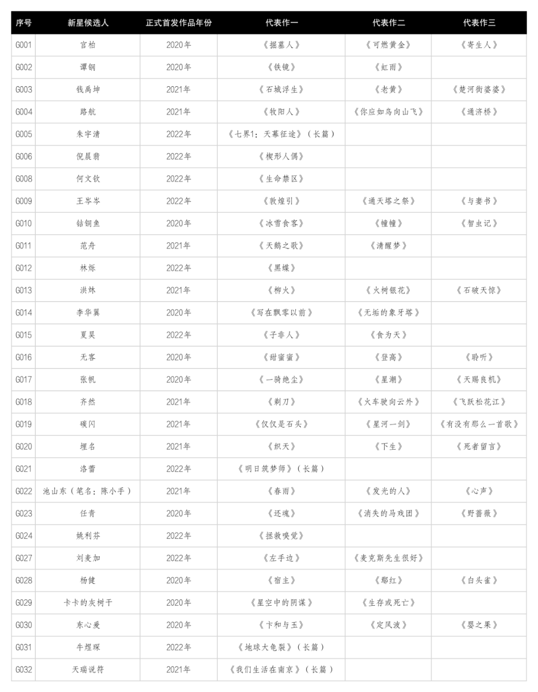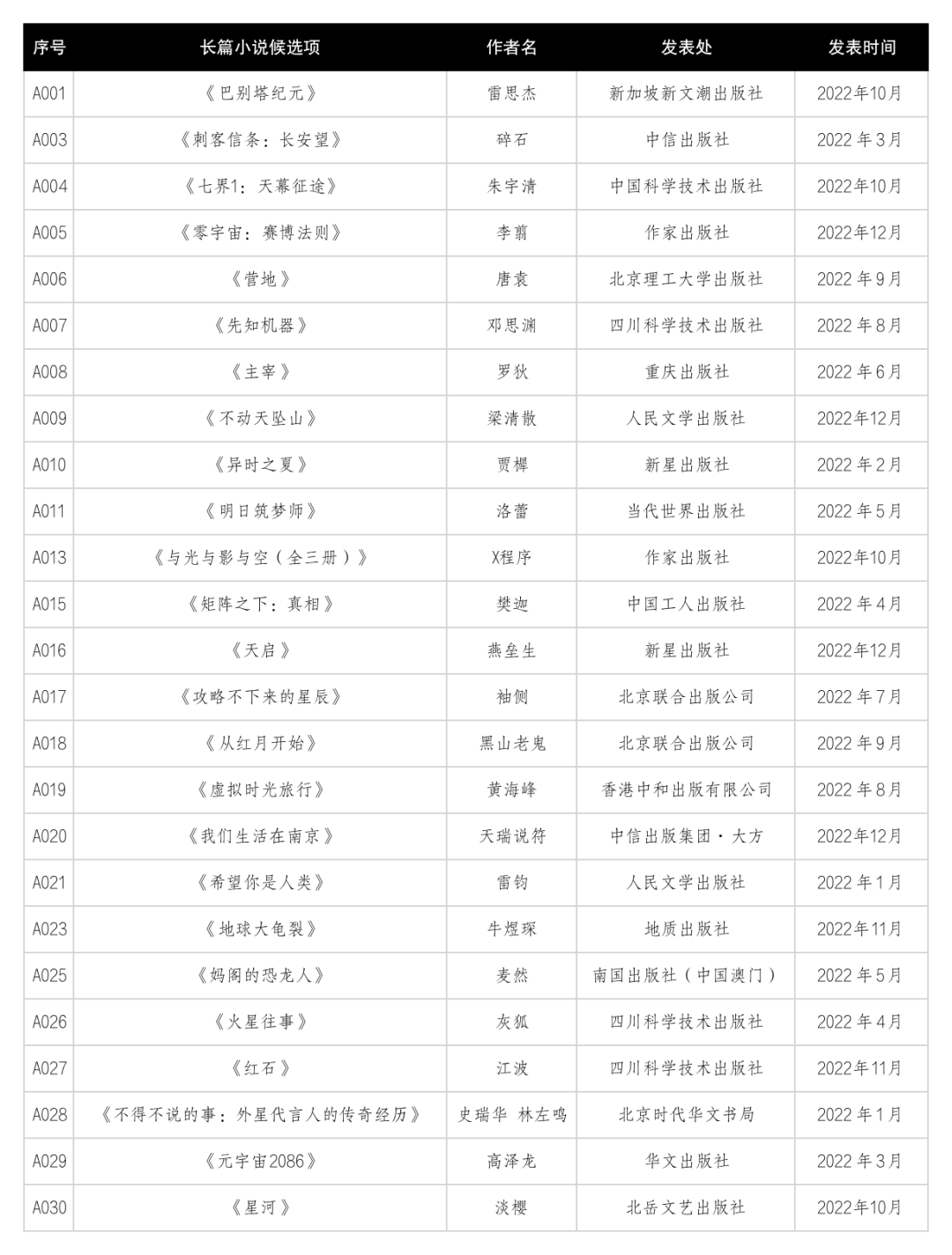 二、中篇小说候选参考名单