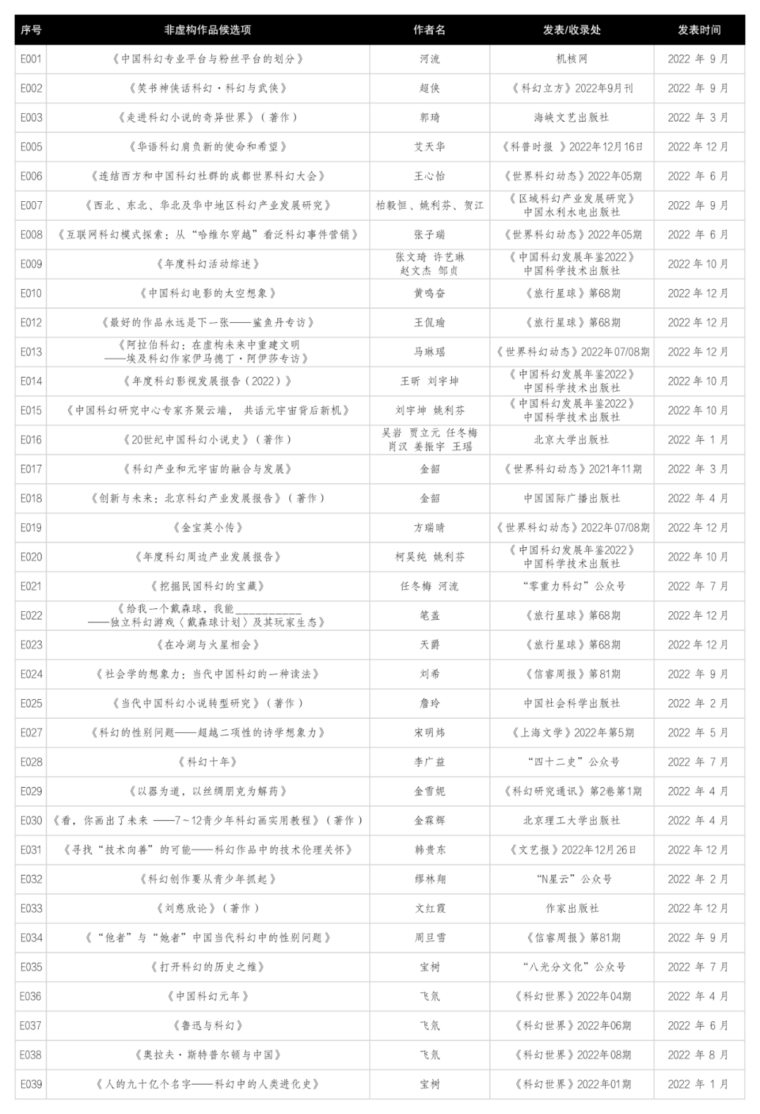 本届获得组织委员会资质认证的中篇和短篇小说非纸质专业发表平台有八家。一部分属于上一届通过认证的平台,经过更新补充资料,继续维持资质认定;另一部分属于新申请平台,经过复核申请资料后也通过了资质认定,名单如下:蝌蚪五线谱;未来事务管理局“不存在科幻”微信公众号;“八光分文化”微信公众号和冷湖科幻文学奖;第十届未来科幻大师奖;第十一届光年奖;咪咕阅读(包括《奇想》电子杂志);17K中文网(包括“奇想宇宙”和“谜想计划”);爱奇艺小说。所有通过资质认证的平台其申报后符合参评标准并通过候选资格复核的中短篇小说已经收入《候选参考名单》。