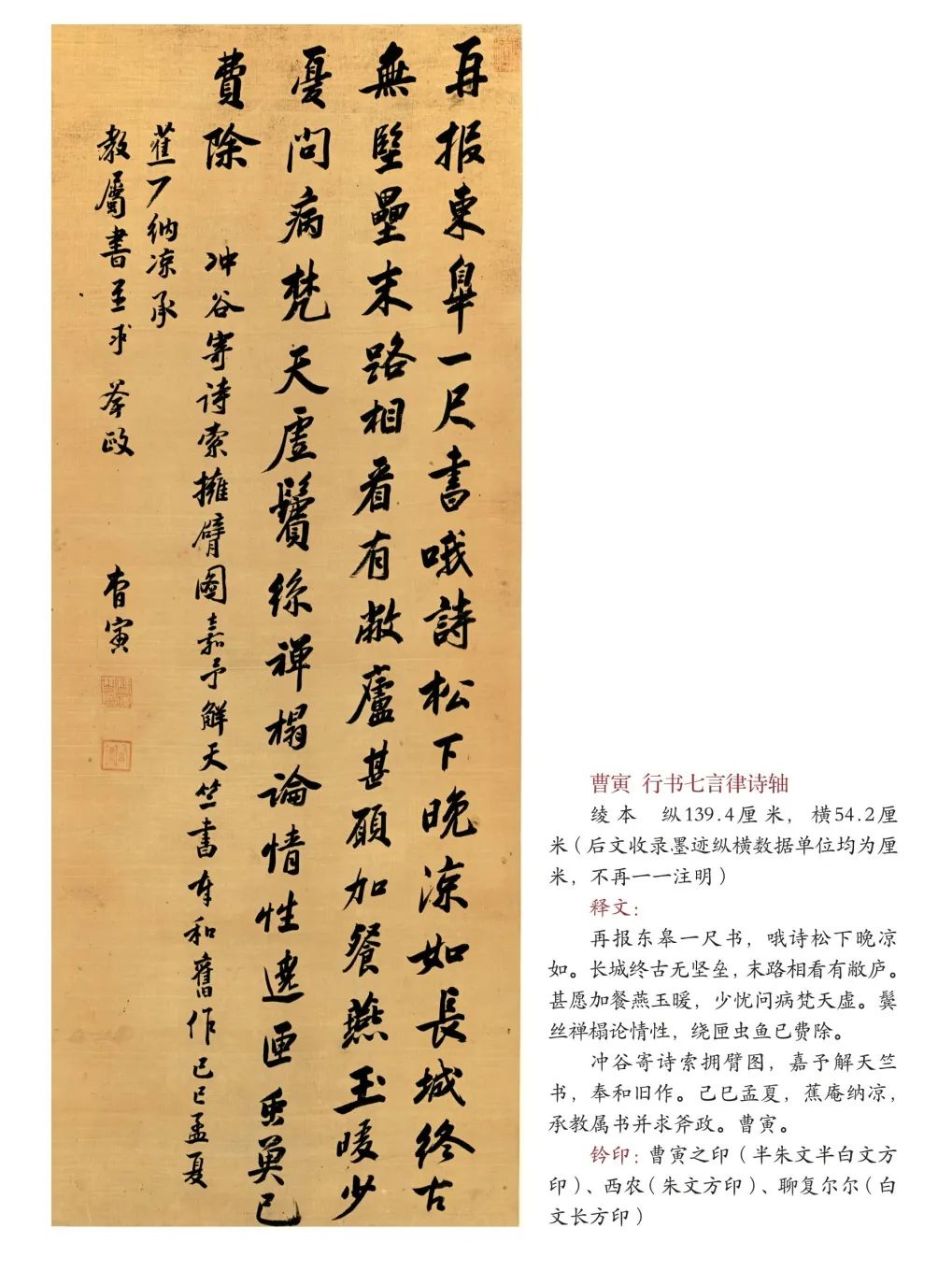最后要谈的就是本书所收录的由田家英早年收藏的曹寅手书诗轴《冲谷寄诗索拥臂图,嘉予解天竺书》。原诗分为两首共八句、十六行,《楝亭集》“楝亭诗钞卷一”收录。或因条幅所限只书写了前一首,因前文已述(见《观其所藏知其所养——田家英与〈红楼梦〉》),这里不再赘言。