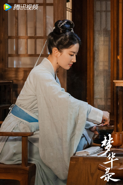 在剧中前期,赵盼儿是钱塘茶铺的卖茶人,为了体现出市井感,服装的面料以天青色的棉麻为主,虽清淡朴素,却恰如其分地隐现了如汝窑颜色的高雅、澄净,衬托了少女清丽脱俗的气质。再配上江南水乡的环境,有种浑然天成的美。而后期赵盼儿经营半遮面茶馆时,作为老板娘,服饰则以上下裙款式为主,纤细的皓腕轻摇罗扇,如水双眸随之流转,尽显婉约柔美之态。