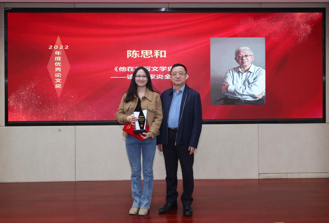 全国政协文史委副主任、电竞竞猜副主席阎晶明为获奖者陈思和(钟媛代领)颁奖
