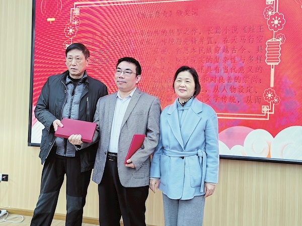 武汉市文联党组成员、副主席董芳(右一)与天津市作协副主席肖克凡(左一),共同为长篇小说《灶王传奇》作者李浩颁奖 通讯员供图