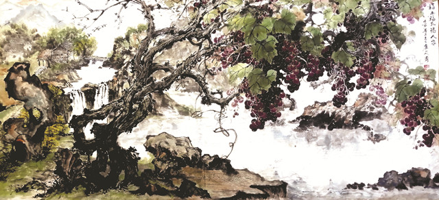 我向来认为,写作和绘画原本应该一体的,这才是文人画的真谛,偏离哪一方面都是一种遗憾乃至缺失。历代文人大抵也都能舞文弄墨,这大概就是文人画的真正来由,国画之说乃后来的泛指。从我个人角度来说,也向来把写作和绘画当成一回事。我把葡萄当成绘画主题,绝不是为画而画,我是怀着对葡萄原根情结的追问和审美冲动而产生绘画冲动,而非只是题材的选择。一边以作家的视角总结出葡萄精神的三种境界和哲学思考;一边以画家的敏感,采用新水墨技法,将国画的写意与油画的色彩结合起来,使光影、线条、色彩呈现出更加新奇的视觉效果,创作出一系列独具特色的葡萄国画作品,壮写西域风情,丝路情怀,敦煌情调,表达对新时代、新丝路的畅想与哲学思考。