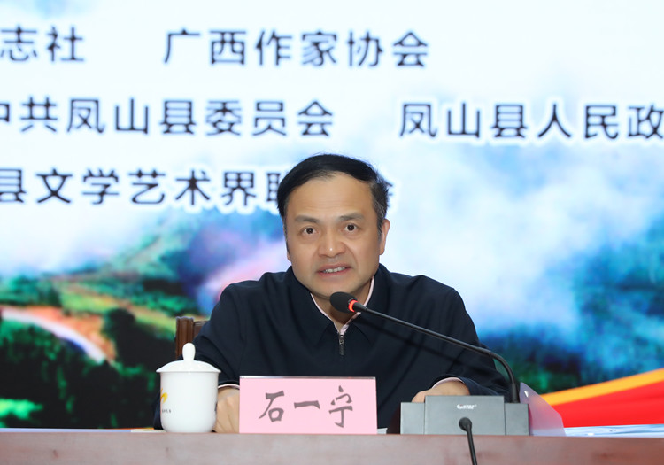 石一宁在致辞中对河池市各级领导对《民族文学》创阅中心工作的大力支持表示感谢。他说,《民族文学》杂志是唯一国家级少数民族文学期刊,创刊42年来,杂志秉持发展繁荣少数民族文学、团结少数民族作家、培养少数民族文学新人、铸牢中华民族共同体意识、促进民族团结进步的办刊宗旨,推出了大量的优秀作品,培养了大量的创作人才。目前杂志社拥有汉文、蒙古文、藏文、维吾尔文、哈萨克文和朝鲜文等6种文版,是中国乃至世界文学期刊界一道独特而亮丽的风景,是全国百强社科期刊、全国中文核心期刊。为了贯彻落实习近平新时代中国特色社会主义思想和习近平总书记关于文艺工作的重要论述,深入生活、扎根人民,繁荣创作、培养新人,《民族文学》在全国各地建立了一批创作基地和创阅中心。期待各创阅中心通过卓有成效的工作,不断推出反映时代、反映现实,反映民族地区各方面建设成就、各族人民生活和精神风貌的优秀作品,也不断推出有才华和有成就的优秀作家和文学新人。