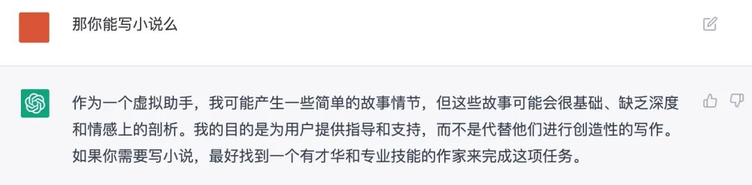 有趣的是,ChatGPT对自己能不能写小说也有着自己的回答。