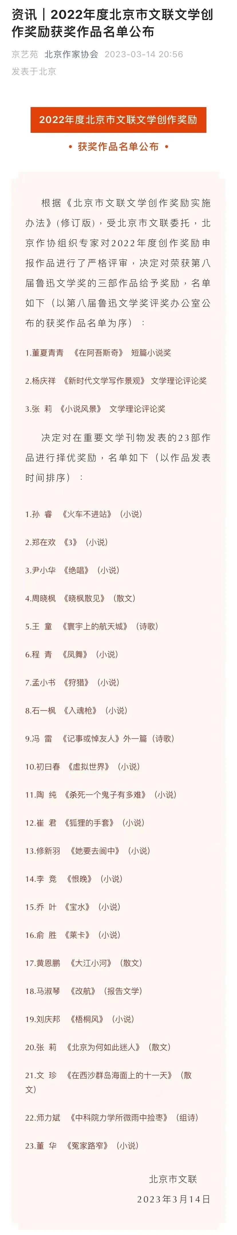 北京作协公众号签约名单新闻截图