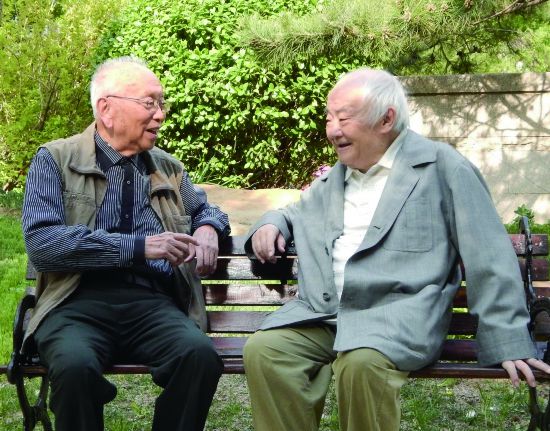 两位先生坐在燕园·泰康之家园区的长椅上,展开关于童年的畅谈,摄于2022年5月。