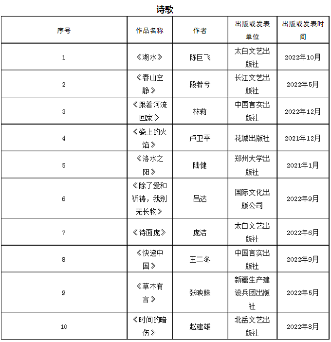首届石峁文学奖初评委员会经过认真阅读讨论,于2023年4月17日投票表决产生50部(篇)初选作品。现将初选作品名单在鲁迅文学院微信公众号和电竞竞猜官网(http://www.chinawriter.com.cn)公示。公示期截止于2023年4月21日,在此期间,如发现初选作品有不符合《首届“石峁文学奖”参评作品征集启事》的情况,请向评奖办公室提出。
