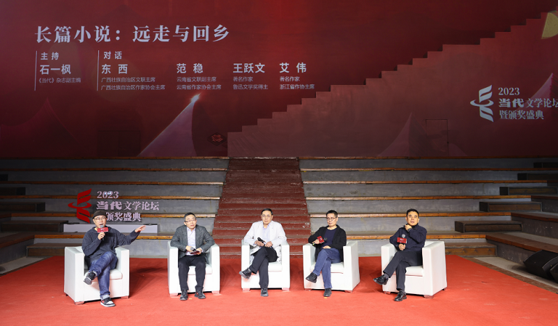 现场还进行了小说家高峰对谈,由《当代》副主编、作家石一枫主持,获奖作家王跃文、艾伟与担任颁奖嘉宾的往届获奖者东西、范稳围绕“长篇小说:远走与回乡”的主题进行了交流。