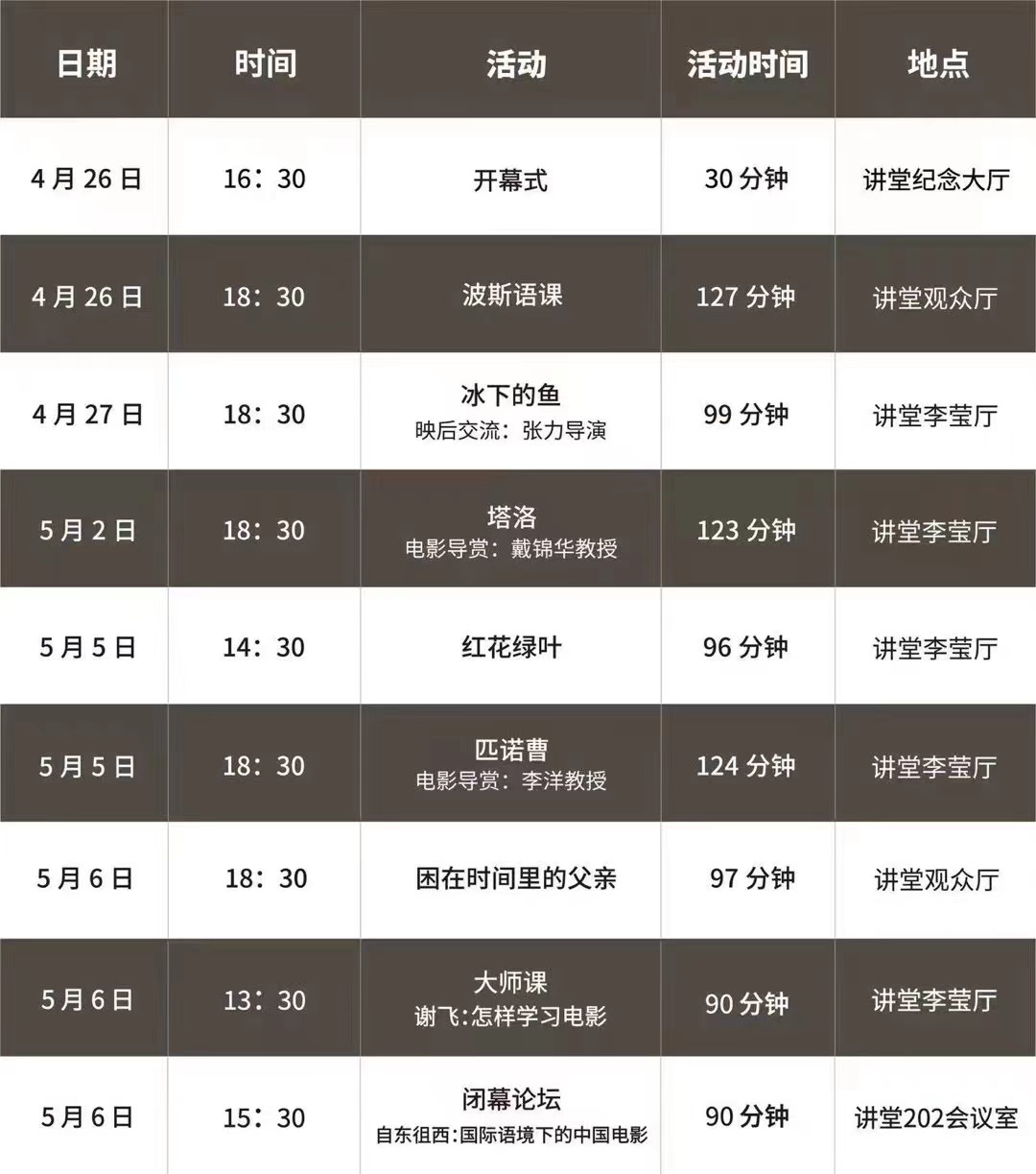 本次金鸡艺术电影展将于4月26日至5月6日在北京大学百周年纪念讲堂举行。期间将展映《波斯语课》《匹诺曹》等6部国内外电影,这些影片均为近两届中国电影金鸡奖提名及获奖作品。电影展活动期间还设置了“映后主创交流”“知名教授电影导赏”“电影大师课”“学术论坛”等环节。参加展映活动的电影创作者和理论研究者将与北京大学师生就展映影片展开对话,并对当下国内外影展和行业现状等进行交流。