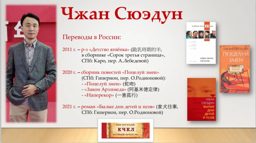 张学东生于1972年,现为宁夏作家协会副主席,其创作的长篇小说《家犬往事》、中篇小说集《蛇吻》和短篇小说《跪乳时期的羊》已分别由圣彼得堡大学汉学家罗季奥诺娃、列别捷娃译成俄文出版。通过俱乐部活动,相关作品得到了俄罗斯中国文学爱好者的广泛关注和讨论。