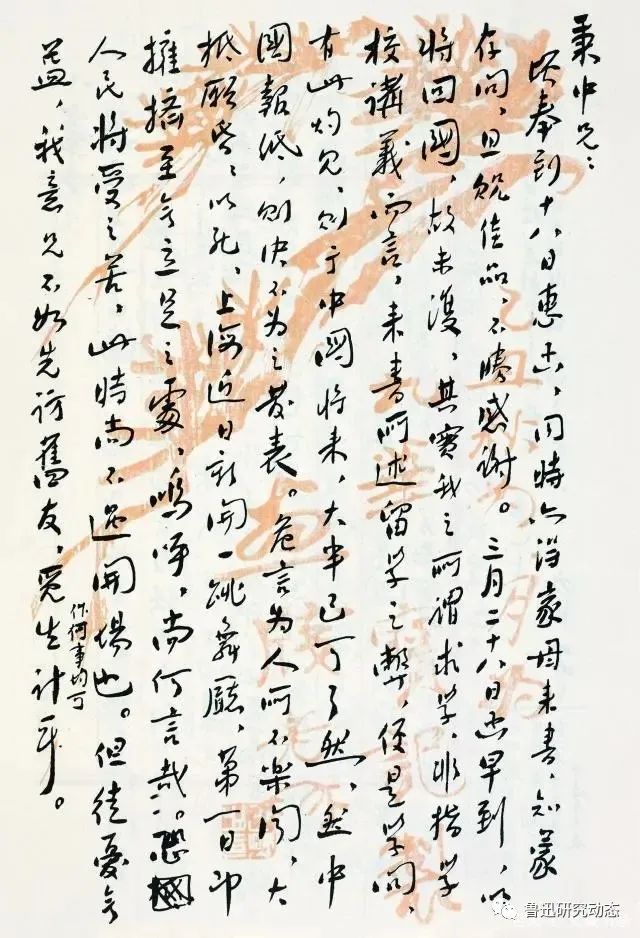 今日阅报,惊悉先生逝世,虽是在办公室中,不禁伏案恸哭。秉中之得有今日,皆先生之赐。十年来奔走不宁,未能偿侍先生讲学之志,诚可痛心。然平日对人处事,一体先生真诚态度,不敢有辱先生,此敢告我先生在天之灵者也。海婴弟方数岁,教养之责,全在师母。伏望节哀,毋损尊体,以肩巨任。回思前日在沪,先生云“病中亦不能停笔休养,因停笔不单医药遂停,即饭亦不得吃也”。痛哉此言,秉中返京二十余日来,晨夕耳中皆如闻先生此言,然又束手无策,不能有所奉助。时时怀念先生病体,而俗务累人,竟未能奉书问候,而今竟成终天之憾事。前次先生面允书数字见赐,病中当尚未书就,敢请师母觅先生所书物事赐寄,以存手泽。