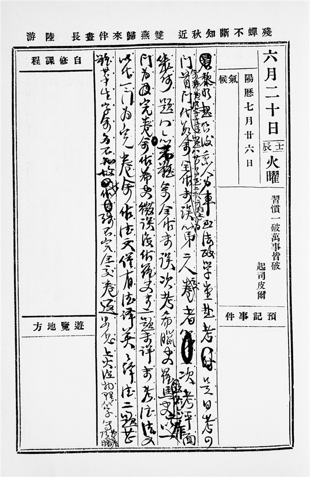 黎明起,食后乘人力车至法政学堂赴考。是日考四门,余卷为戊字十三号。首门代数,题八,甚易,至二次方程止,余全作未误,为第二人交卷者。次考平面几何,题八,亦不难,余全作未误。次考希腊史、罗马史,题各六,以作一门为完卷,余作希史,微误;复作罗史,末二题未详。末考德法文,以作一门为完卷,余作德文,仅有德译英、英译德二题,甚难,其中生字余多不知,故此作殊不完全,交卷。返,略息。上火。温物理、化学等,甚暑乃睡。