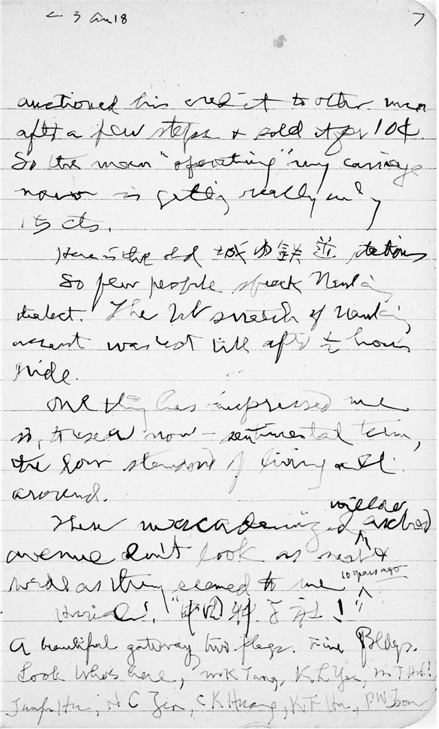 Hurrah!“中国科学社!”A beautiful gateway, two flags. Fine Bldgs. Look, who's here? MK Tang,KL Yin, MT Hu! Tunfu Hu, HC Zen, CK Huang, KF Hu, PW Tsou, MC Hu, CC Chu, C Yang, STWang, CL Lan. Is the convention over? No, your paper is scheduled for tomorrow.好哇!“中国科学社!”美丽的大门,两面旗帜,漂亮的楼房,瞧!都是谁在这儿,MK Tang, KL Yin, 胡明复!胡敦复,任鸿隽,CK Huang,胡刚复,邹秉文,MC Hu,竺可桢,杨铨,ST Wang, CL Lan。“会议结束了吗?”“没有,你的论文在明天宣读。”(本段识读及翻译由赵新那女士完成,第9册内文的英文识读均由赵新那女士完成。)