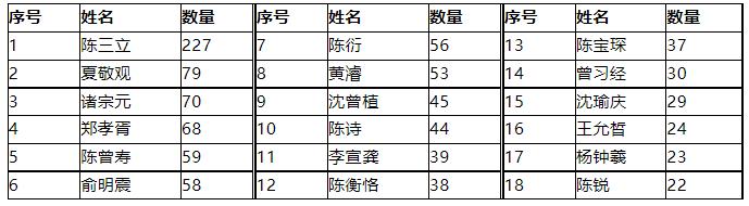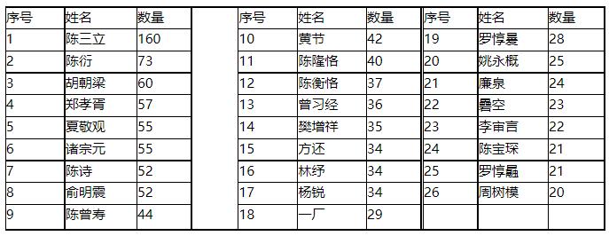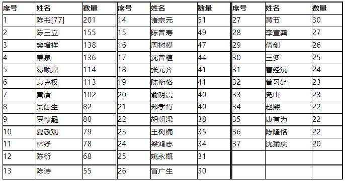 上海《东方杂志》1908-1920年间,“文苑”(包括“诗选”“海内诗录”)共101期,165位诗人发表了1490馀题旧诗,发表作品(包括极少量的文和词)超过20题的诗人有18位: