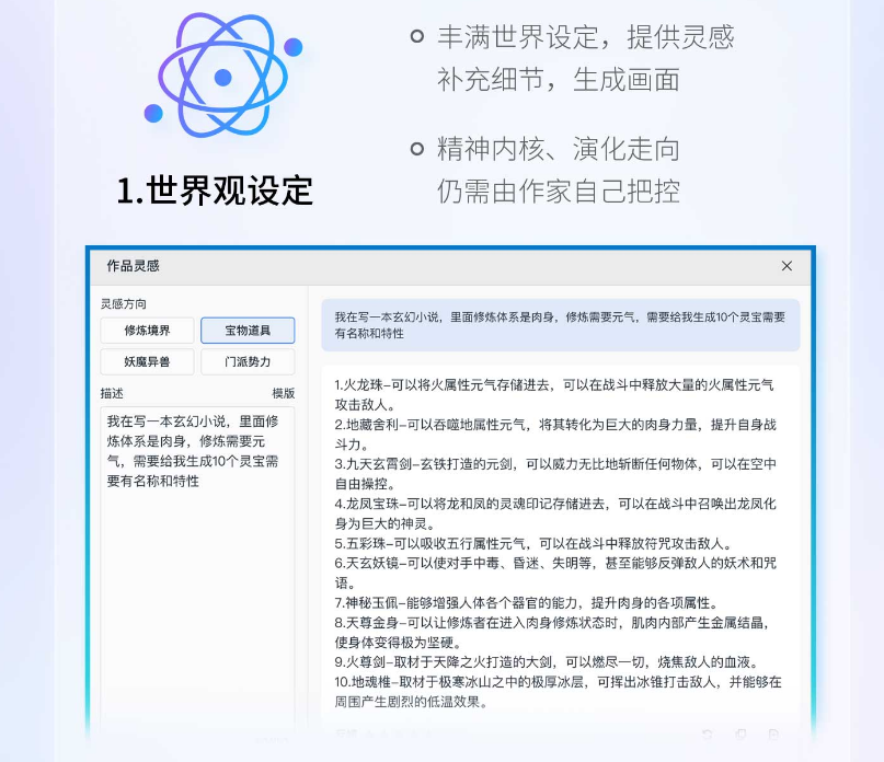 黄琰仔细讲解了“作家助手妙笔版”的四大功能:世界观设定、角色设定、情景描写和打斗描写,举例展示了这些功能如何帮助作家丰富细节、辅助创作、提升效率等。比如,世界观设定是网文创作前期筹备的重要内容之一,涉及武力值、地图、门派势力等多重细节,“作家助手妙笔版”的世界观设定功能,能为作家丰满世界观设定,生成大段内容补充,并完善细节。但世界观的精神内核、演化走向,仍需作家自己把握。