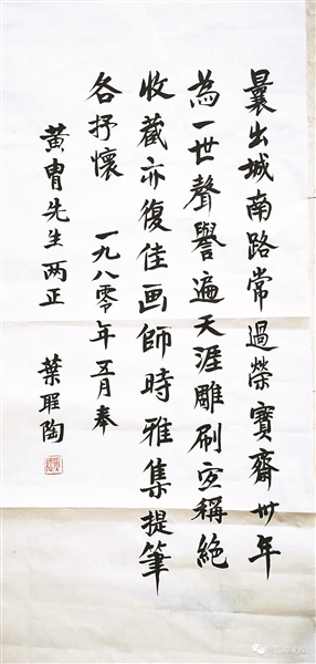 “雕刷宐称绝”的“宐”通“宜”,《说文》“所安也。从宀之下,一之上”。荣宝斋19世纪末设立“帖套作”机构,为后来木版水印事业的发展奠定了基础,自然是“雕刷宐称绝”的了。当年的荣宝斋经常举办书画家们聚会雅集的活动,所谓“画师时雅集 提笔各抒怀”,这幅圣老题黄胄大师的条幅,应该就是在雅集上相互题赠的抒怀雅物。
