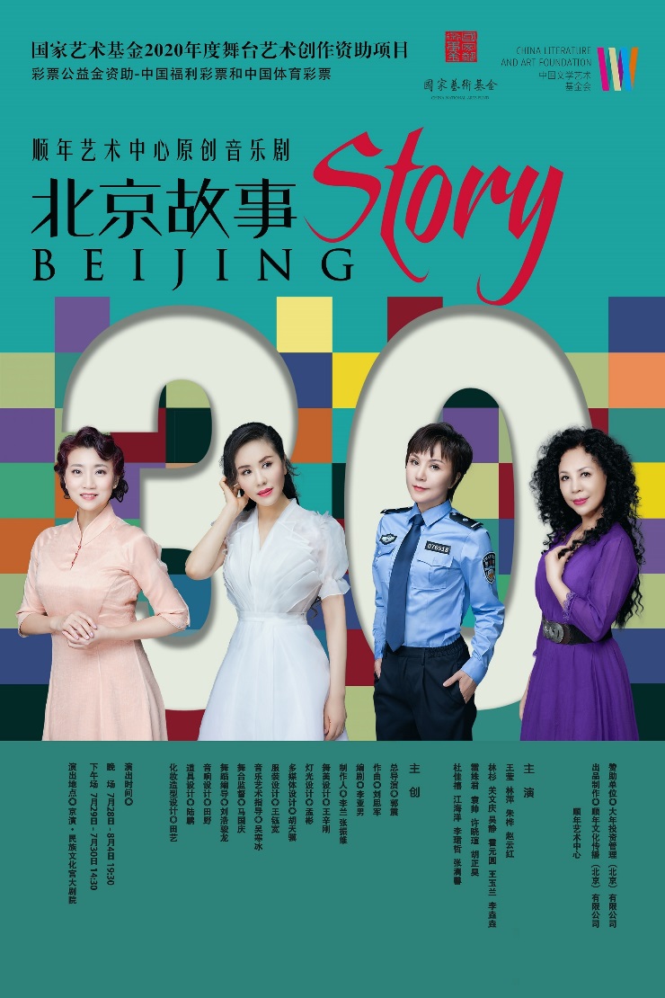 音乐剧《北京故事》由顺年文化传播(北京)有限公司和顺年艺术中心联合出品制作,是彩票公益金资助—中国福利彩票和中国体育彩票、国家艺术基金2020年度舞台艺术创作资助项目,以及中国文学艺术发展专项基金资助项目。作为一部以现代城市故事为题材并命名的原创音乐剧,该剧以概念音乐剧的创作手法,刻画了一组中年女性的群像,讲述了四位北京大妞儿由一个30年前的约定,引出一场30年后的欢喜相聚。四帧中年女性的人生快闪,呈现了她们为赴30年之约所展开的一系列关于事业、爱情和生活的故事。
