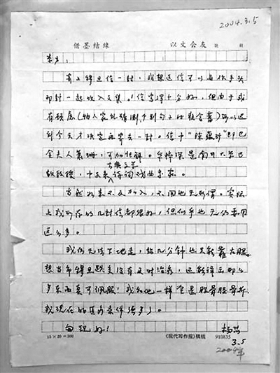 “附上我在家找到的巫宁坤(西南联大、芝加哥大学同学、南开大学同事)旧作,供参考。查英传常来电话,比较细心,我尽可能提供他信息。最近让他打电话给周定一(西南联大南荒社、高原社骨干成员),很有帮助。”对如何编好《穆旦诗文集》,杨苡老师作为过来人与当事者,也提出中肯的建议:“我个人以为全集前面的序不宜为仅上三个学者的文章摘抄,毕竟都是学院派的。我以为谢冕的《论中国新诗》(已获北京三联文艺评论一等奖)中必有论穆旦的,应当摘录。还有诗人周良沛写的(中国新诗穆旦卷卷首)你可能已收到赵蘅寄给你的那本小书‘穆旦诗选’。还有巫宁坤写的一篇都可以摘取一些,使前面的代序更丰富些,也表示众口皆碑。所谓‘代序’,也就是用了学者、诗人对穆旦的评价。对了,还有邵诗人(邵燕祥)那篇精彩的发言(已收入邵诗人最近出的集子中)也不能忘记。这样便有七位著名学者诗人对穆旦的评价。你看对不对?这样摘抄,我个人认为更能使人耳目一新。”(2004年2月23日信)