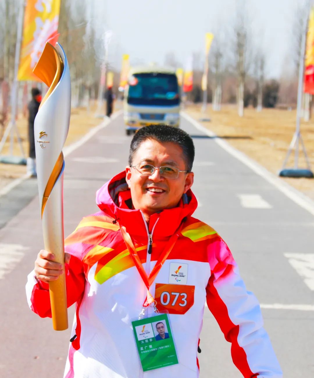 2022年3月3日,作为冬残奥会火炬手,孟广策在张家口怀来官厅水库国家湿地公园参加完了火炬传递仪式,他在这里举着火炬走了90米。有记者采访他,他说:“这不单单是我的荣誉,更属于和我一样奋战在一线的广大电力员工。”