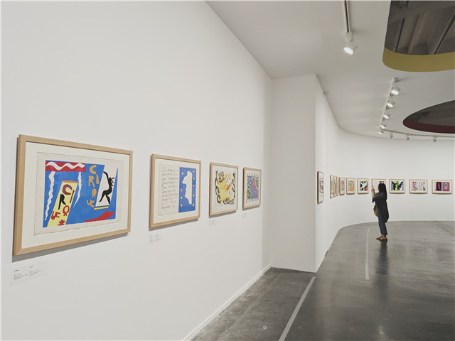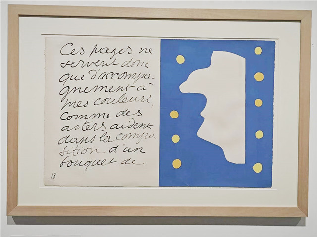 经常有人将剪纸误读为 72岁的马蒂斯因疾病缠身、无法再提笔绘画的权宜之计。事实上,艺术家在裁剪造型、构图与定稿过程中体现了对自我和作品近乎严苛的要求。展陈中可见大量的剪纸作品及运用此方法创作的艺术书(其中最著名的是于1947年9月出版的《爵士》)、戏剧舞台设计、壁画、纺织物、彩色玻璃花窗等衍生作品,通过事实纠正了可能发生的误读。