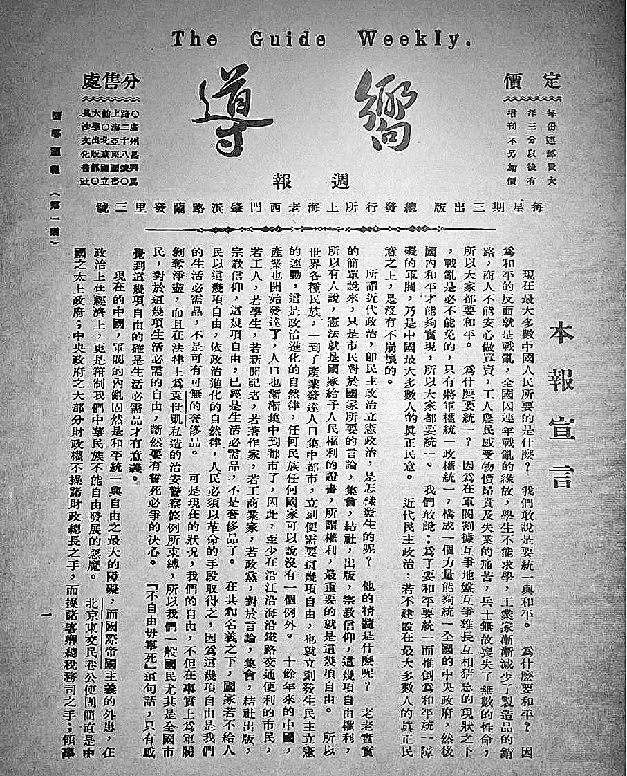 1922年9月13日,《向导》周报在上海创刊,每星期三出版,十六开四版,以政论、时评为主。1923年,党中央对党团报刊进行分工,规定《新青年》季刊是“学理的马克思主义的研究宣传机关”,《前锋》月刊是“中国及世界的政治经济的研究宣传机关”,《向导》是“国内外时事的批评宣传机关”。1923年11月,中共中央在一份报告中指出,在党所创办的《前锋》月刊、《新青年》季刊和《向导》周报三种刊物中,“《向导》在社会上稍有影响”。