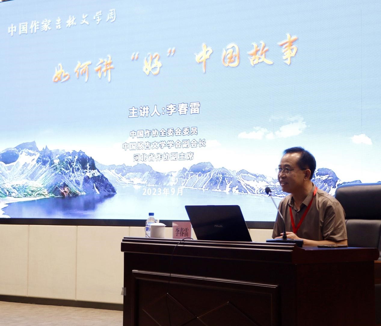 李春雷走进位于长春市宽城区团山街道的长山花园社区,以“如何讲好中国故事”为题,同大家分享了自己创作报告文学的心得体悟。他在现场阐述了自己对“中国故事”的认识,即具有中华文化特质的、反映中国人民为追求理想生活不懈奋斗的经典故事,并总结了目前纪实文学存在的问题。“未来的时代是纪实文学的时代,面对精彩生活,文学爱好者要主动记录,要从热爱到酷爱、由小我到大我、由走近到走进、由感动到感悟。”李春雷说。