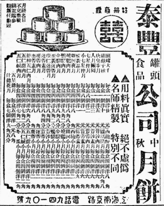 所以该公司后来自称月饼大王,诚非虚骄:“近年以来,对于点食一道,日新月异,即以中秋月饼一种而论,已不胜数,然能以大王自居者,具有个数,此所以敝公司得独占月饼之盛誉也。兹将特点列后,俾各界在中秋令节,欲以月饼送礼者,知所选择矣:色香味之佳,可算得大王;种类之特多,可算得大王;焙制之精洁,可算得大王;装璜之美丽,可算得大王;货品之真实,可算得大王;售价之公道,可算得大王;经久之不变,可算得大王;受众之欢迎,可算得大王。泰丰罐头食品公司谨启。”(《欢迎泰丰月饼大王》,《申报》1927年9月7日第10版)而且终民国之世,他们都一直供应月饼:“泰康公司中秋月饼:科学焙制,皮薄馅足。”(《申报》1946年9月2日第2版)
