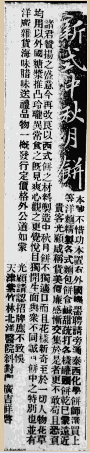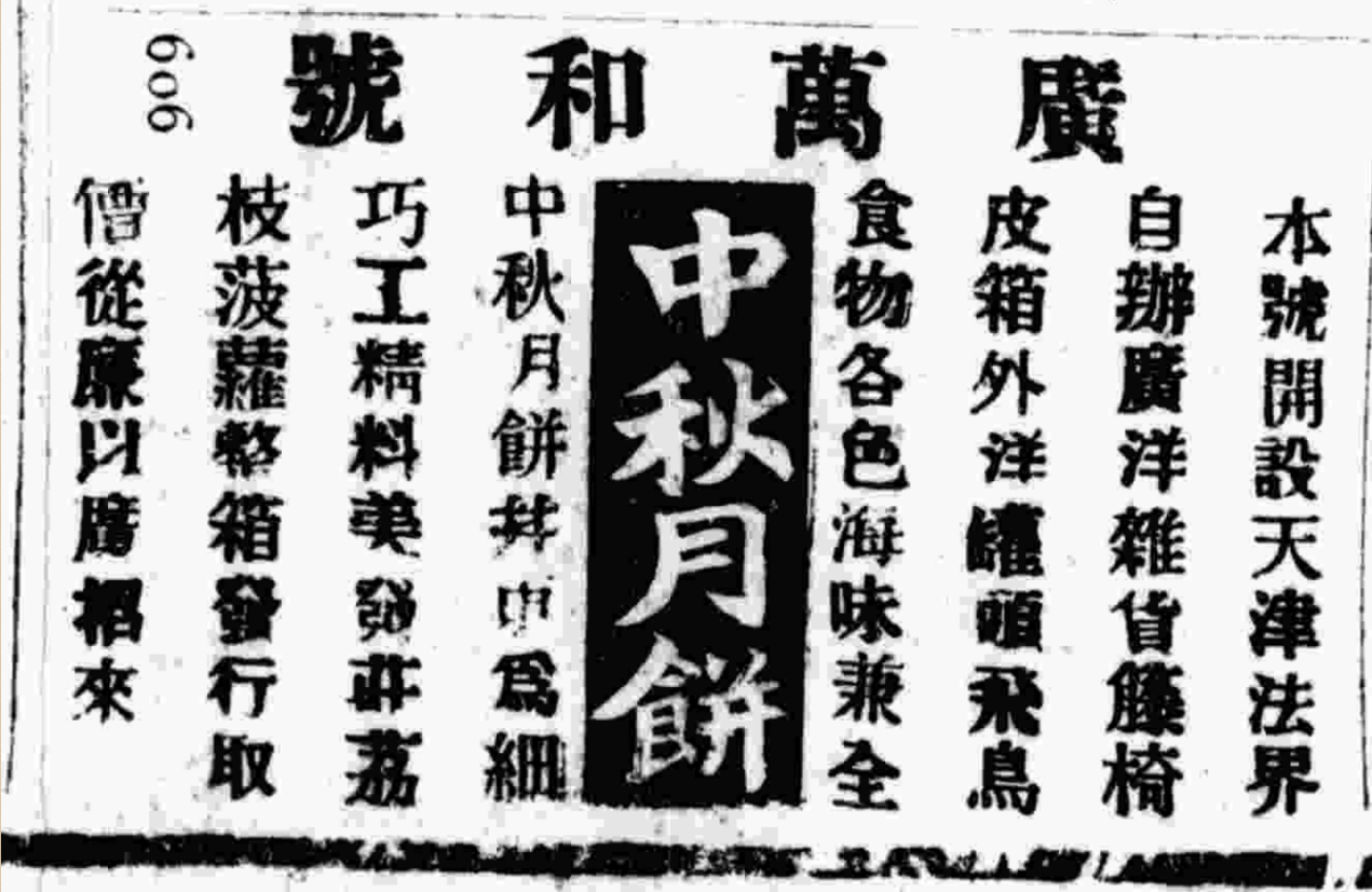 上海如此,省港如此,在另一重要通商口岸天津也是如此。起初是广货店兼营月饼,但在广告版面上已经着重突出,如《大公报》天津版1905年8月15日第4版广万和号的“中秋月饼”广告:“本号开设天津法界,自办广洋杂货、藤椅皮箱、外洋罐头、飞鸟食物,各色海味兼全,中秋月饼并重……”“中秋月饼”,大字置于广告正中。