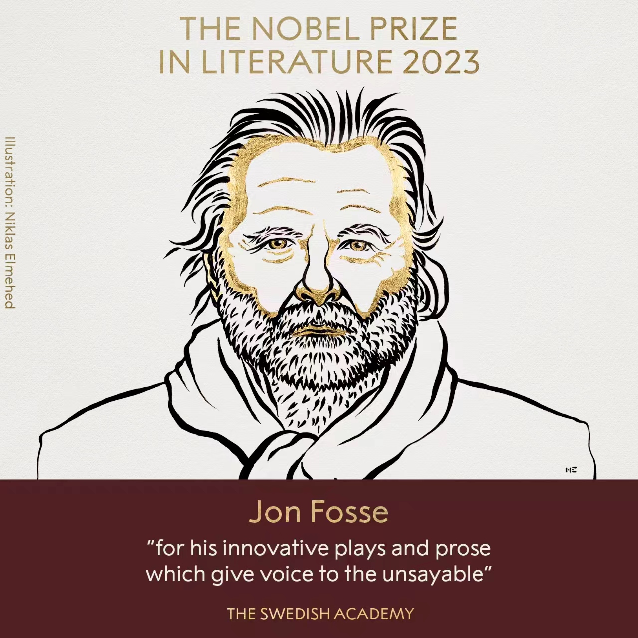 瑞典斯德哥尔摩当地时间2023年10月5日13:00(北京时间19:00),瑞典学院将2023年度诺贝尔文学奖颁给了挪威剧作家约恩·福瑟(Jon Fosse),以表彰他“创新的戏剧和散文,为不可言说的事情发声”。