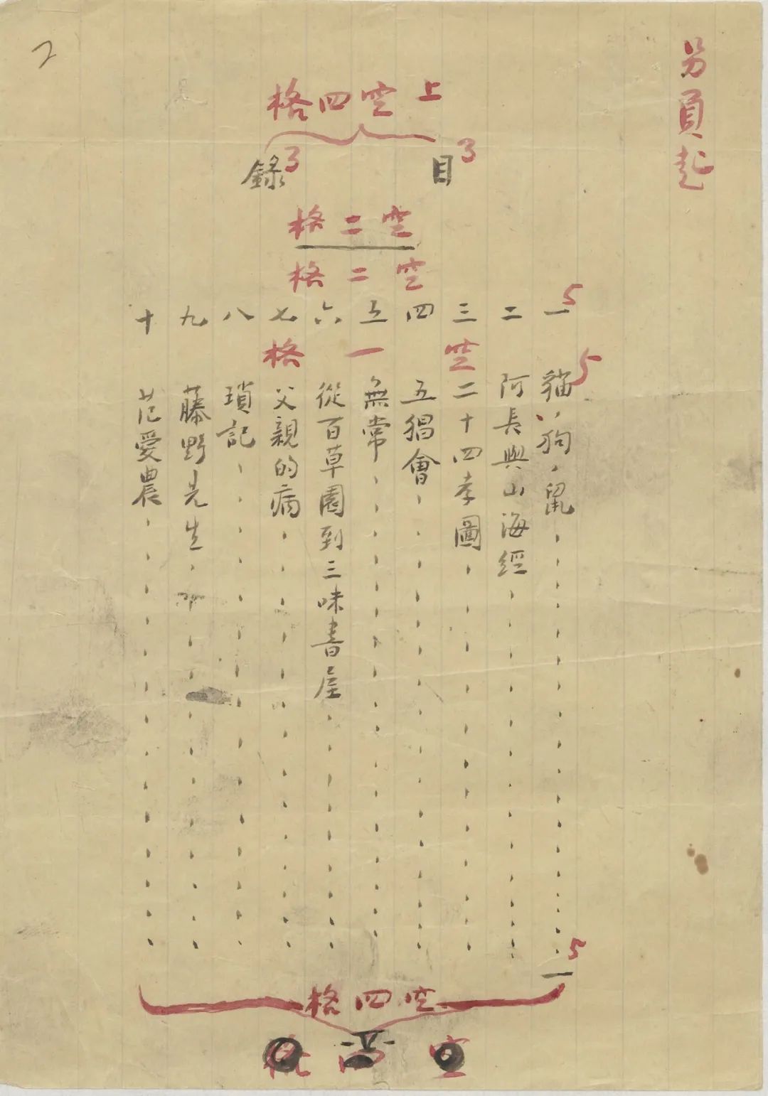 1.《朝花夕拾》现存所有手稿:包括2篇小引、1篇后记、7篇散文,另有目录和扉页(见插图)。《朝花夕拾》所收10篇回忆散文原以“旧事重提”为总题名发表于《莽原》半月刊,因此手稿中都有副标题“旧事重提之X”。这批手稿修改较多,目录、扉页、《小引》副稿都有鲁迅本人朱笔标注的排印格式。《二十四孝图》《五猖会》《无常》《父亲的病》《后记》等5种手稿都有红笔标格式字号等,是用于排印发表留下的痕迹。《朝花夕拾》稿件寄交韦素园、李霁野、台静农等,鲁迅去世后由李霁野交还许广平。