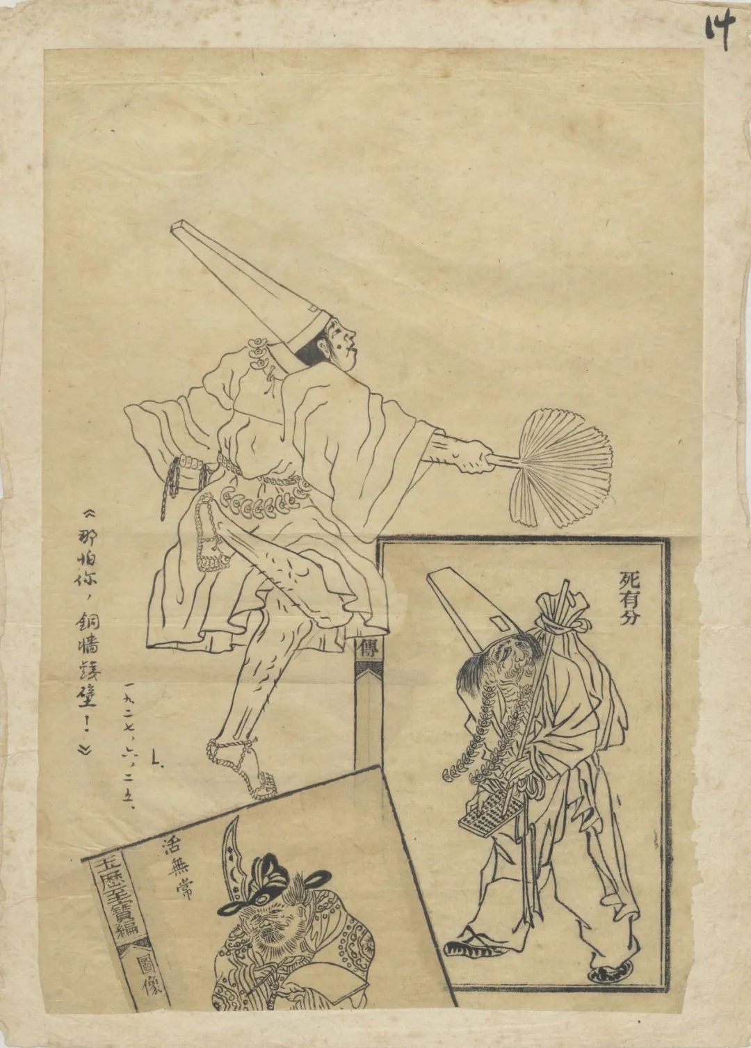 2.《〈朝华夕拾〉后记》:作于1927年7月11日,最初发表于1927年8月10日北京《莽原》半月刊第2卷第15期,署名鲁迅。《后记》手稿共19叶,文字部分使用“文艺丛书稿纸”,另有4叶插图,描绘“曹娥投江寻父尸”、老莱子戏彩娱亲、玉历宝钞等书中的无常图像,主要是剪贴在白纸上的印刷品,并有少量鲁迅手书文字与填描图案。其中最特别也最珍贵者当数鲁迅本人手绘“所记得的目连戏或迎神赛会中的‘活无常’”(见插图),可窥见作者美术修养之一斑。